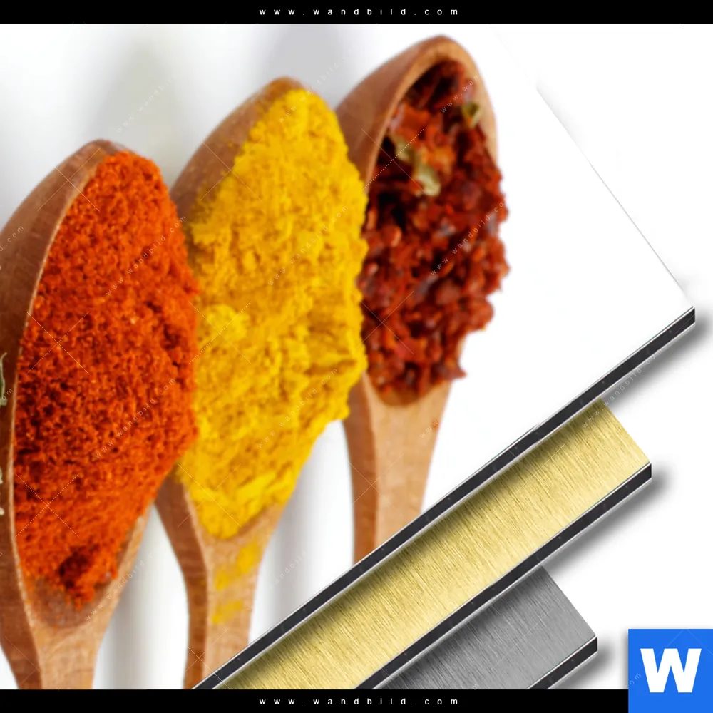Alu-Dibond Bild | Farbige Gewürze auf Holzlöffel | Hochformat