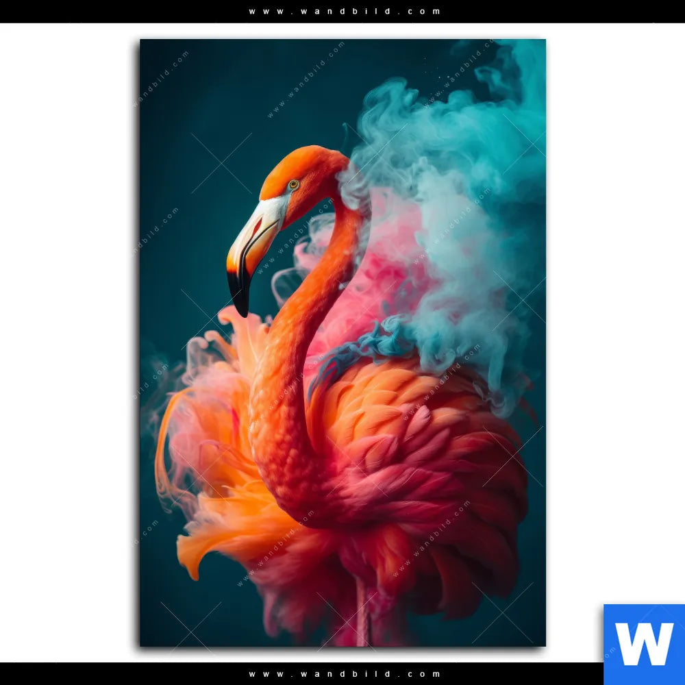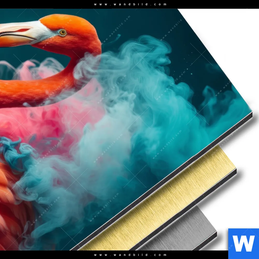 Alu-Dibond Bild | Flamingo in bunter Rauchwolke | Hochformat