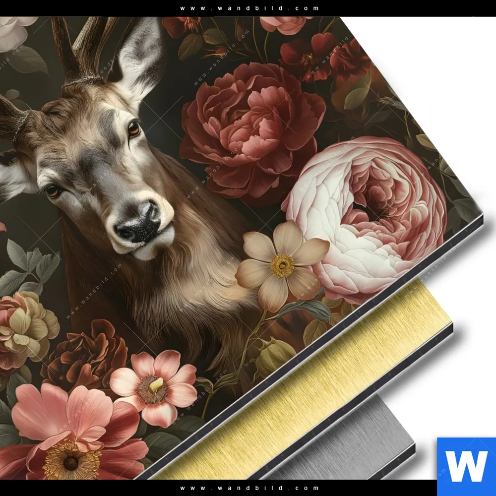 Alu-Dibond Bild | Friedlicher Hirsch und Blüten | Rund