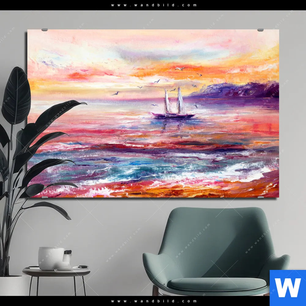 Alu-Dibond Bild | Gemälde mit Boot im Sonnenuntergang | Querformat