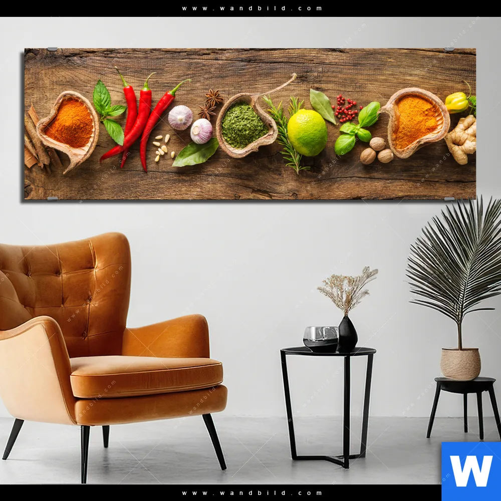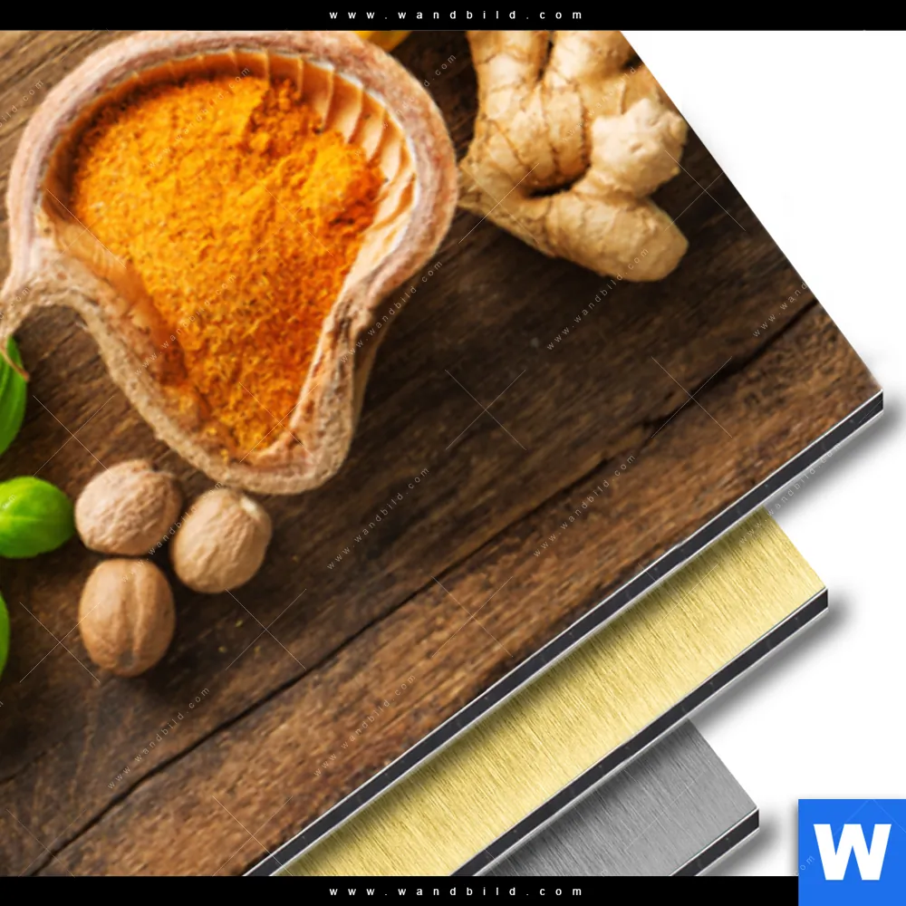 Alu-Dibond Bild | Gewürze & Kräuter auf Holz | Panorama