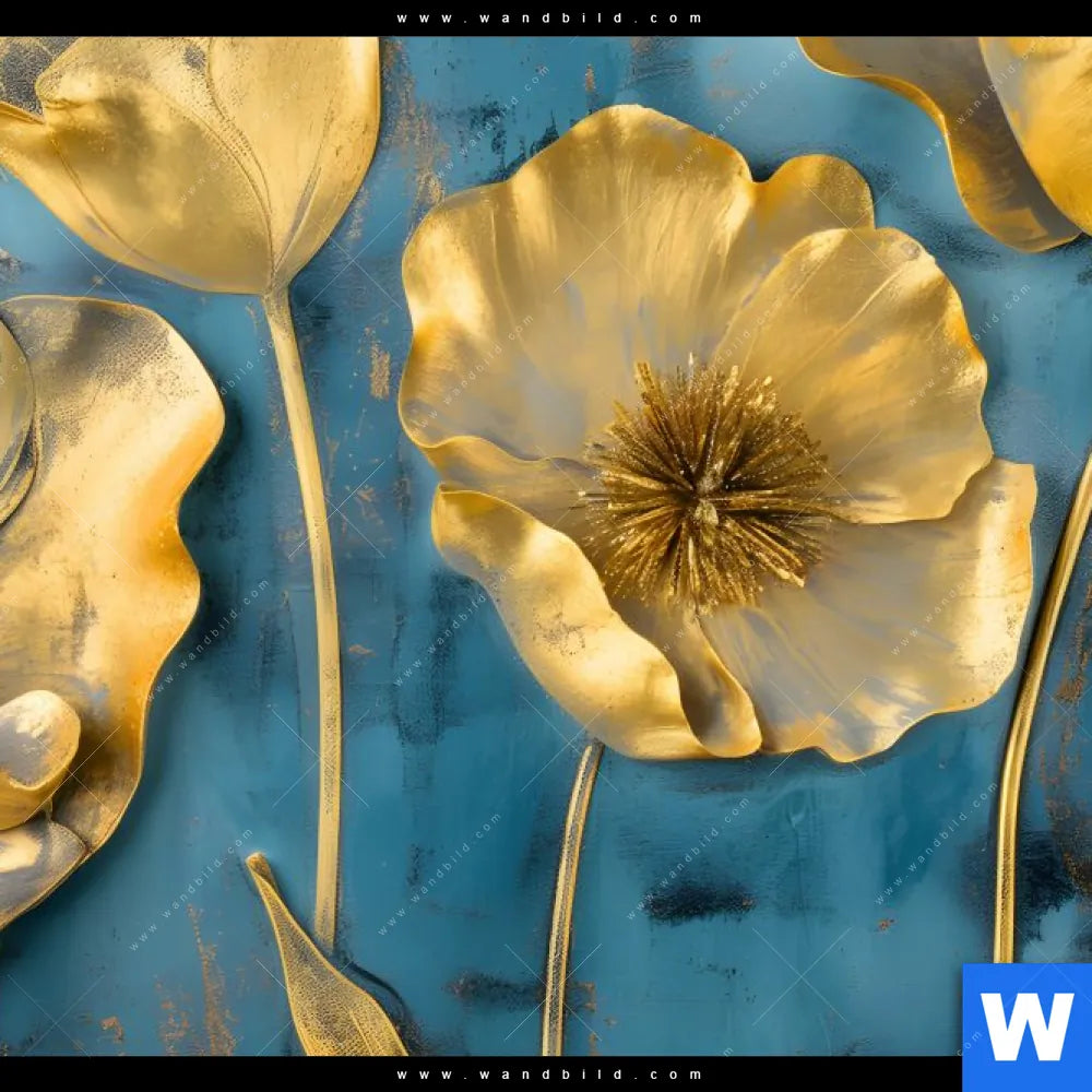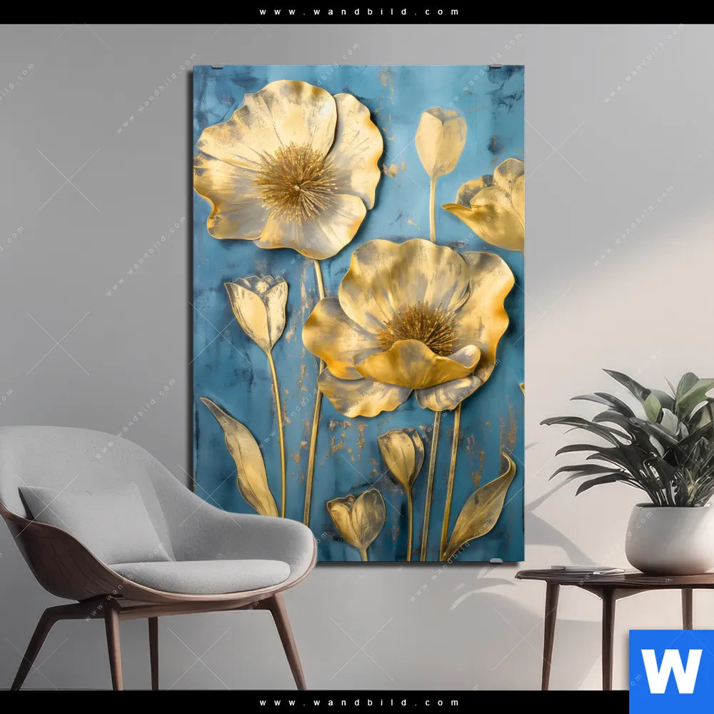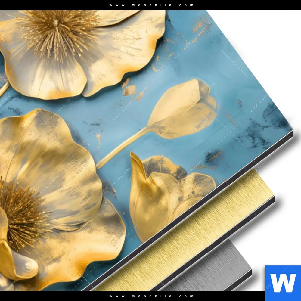 Alu-Dibond Bild | Goldene Blumen auf Blau | Hochformat