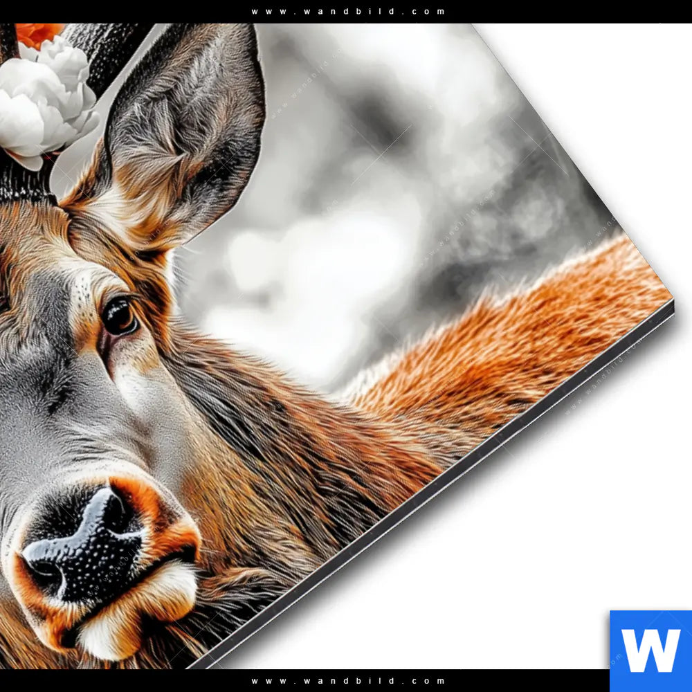 Alu-Dibond Bild | Hirsch mit Blumenkrone | Querformat