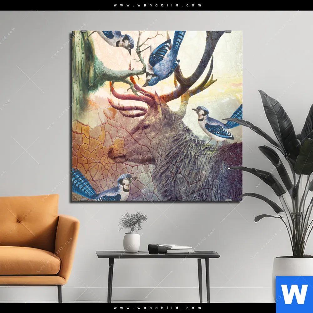 Alu-Dibond Bild | Hirsch & Vögel | Quadrat