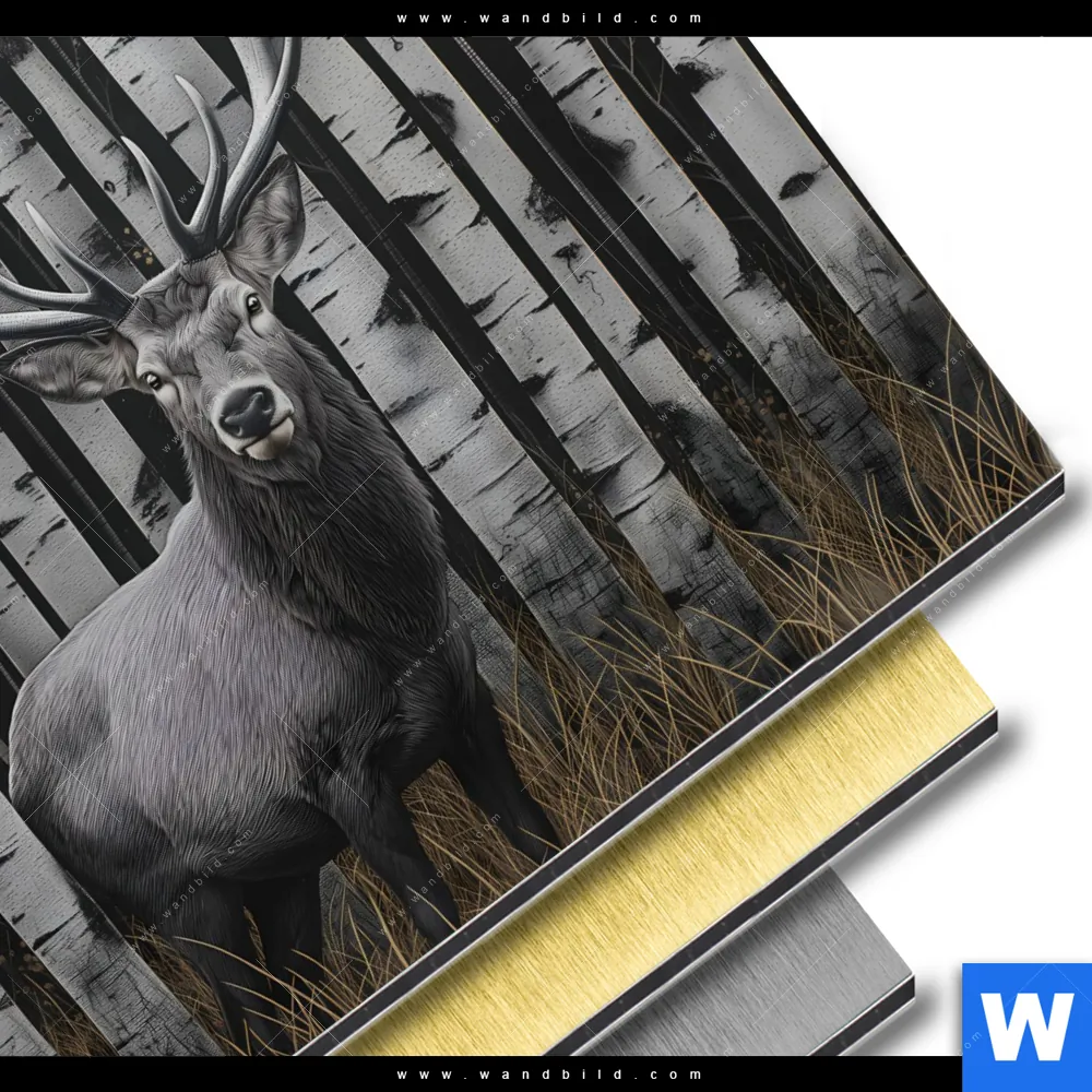 Alu-Dibond Bild | Hirschporträt vor Birken | Quadrat