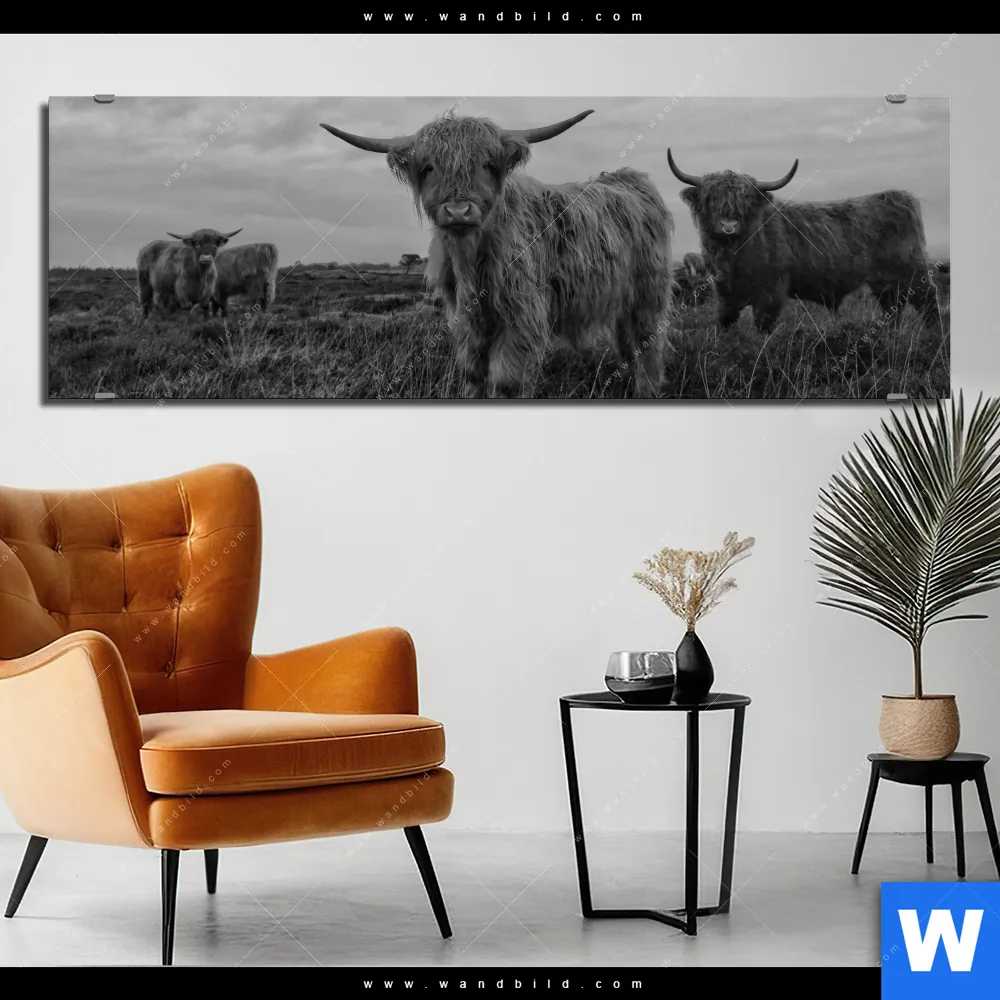 Alu-Dibond Bild | Hochland-Rind Schwarz-Weiß | Panorama