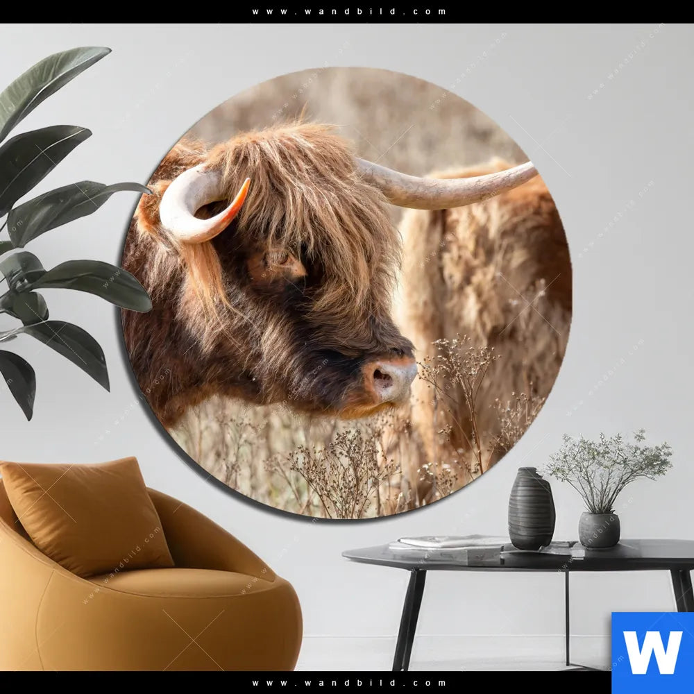 Alu-Dibond Bild | Hochlandrind auf Weide | Rund