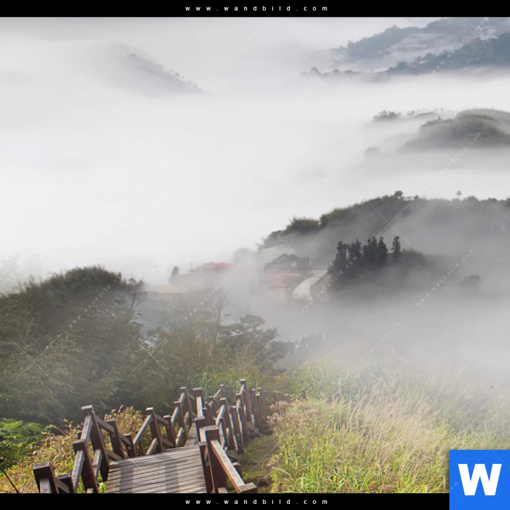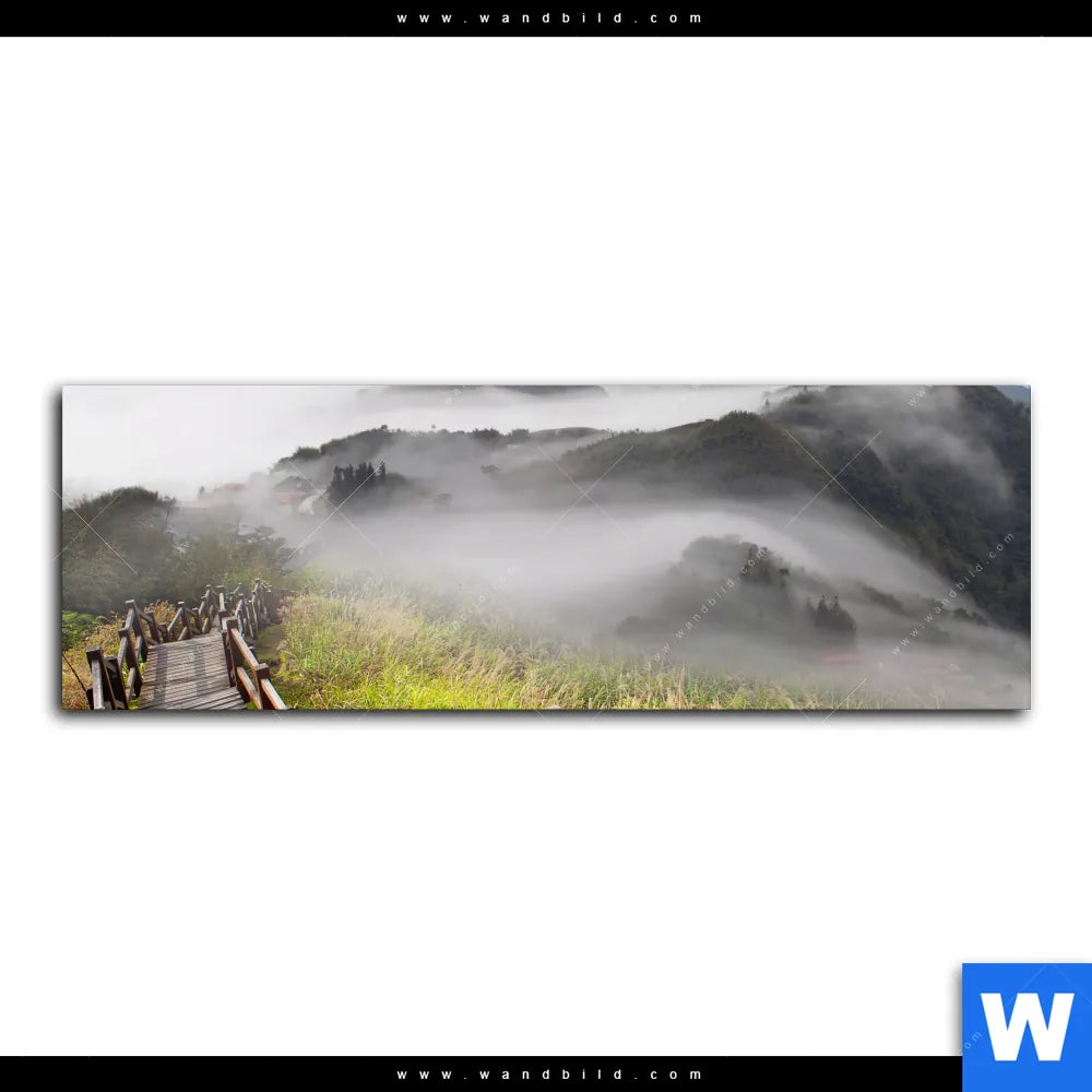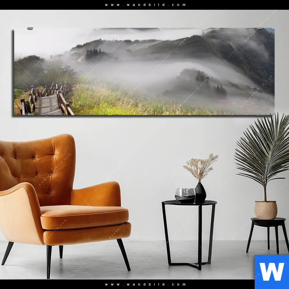 Alu-Dibond Bild | Holztreppe auf Berg mit Wolken | Panorama