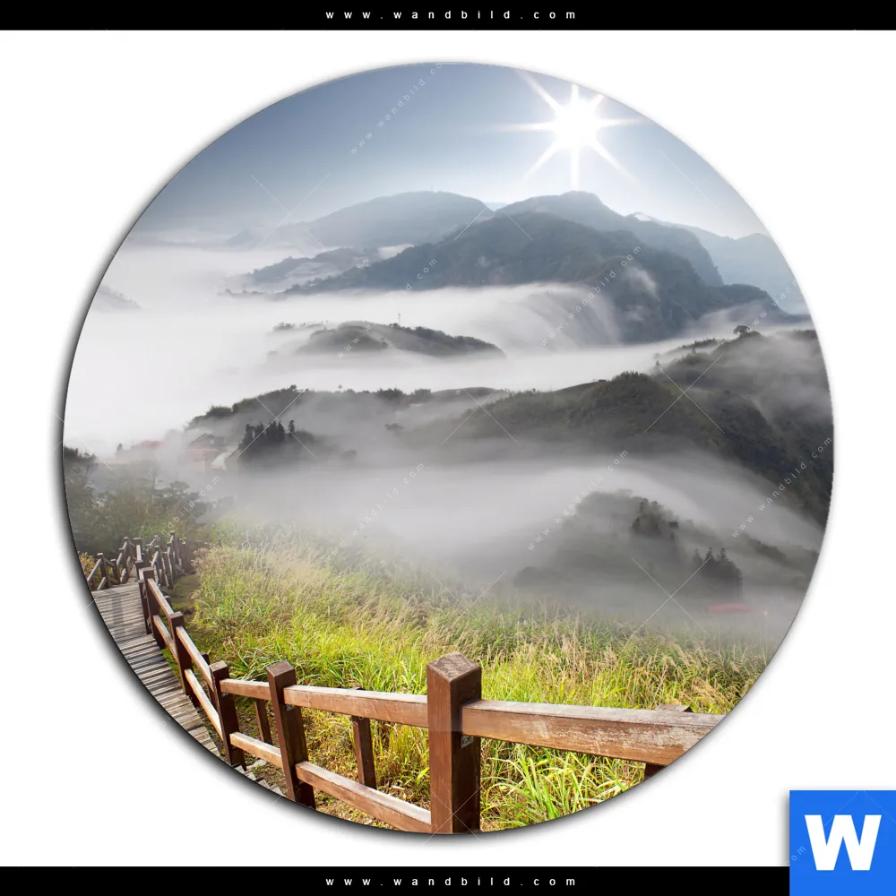 Alu-Dibond Bild | Holztreppe auf Berg mit Wolken | Rund