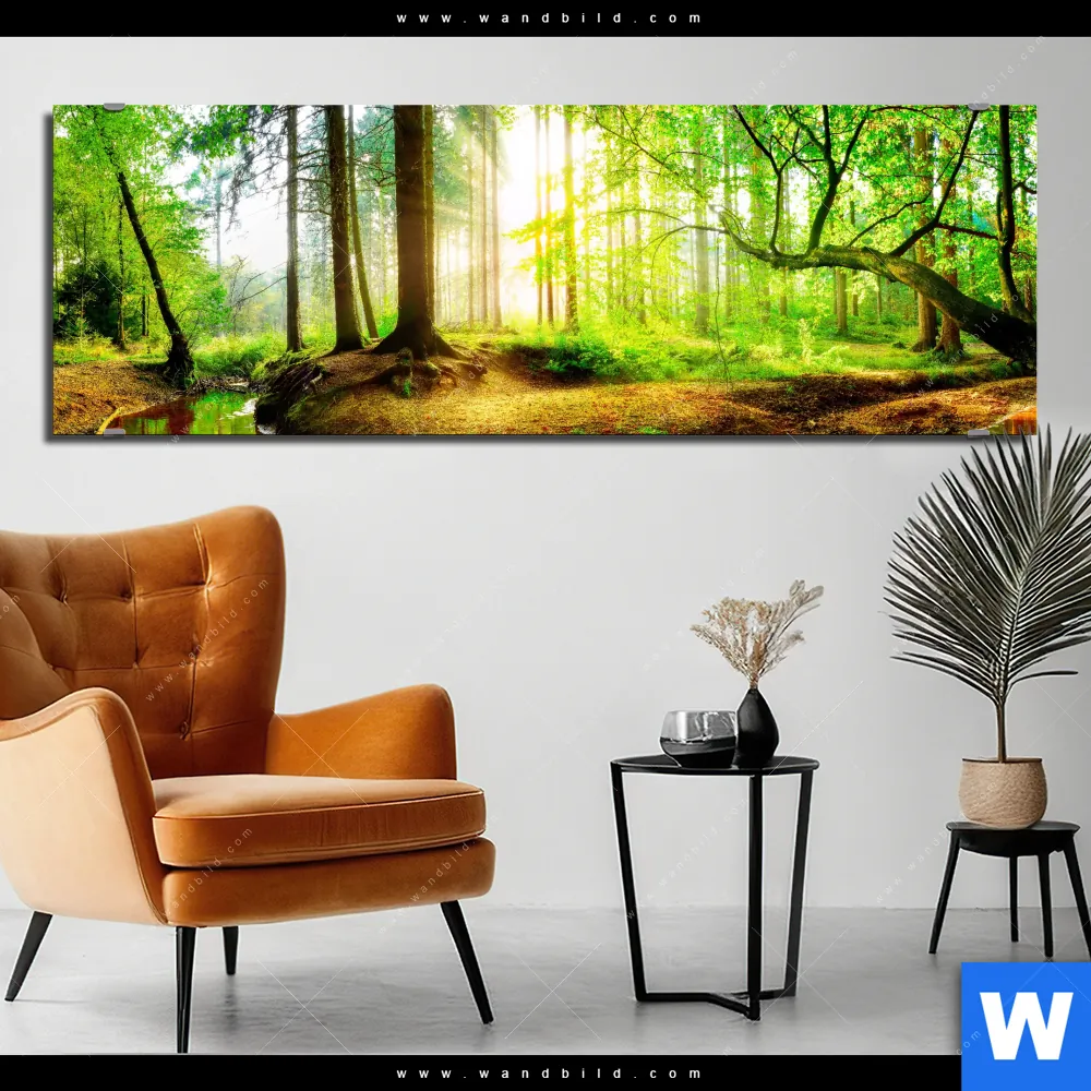 Alu-Dibond Bild | Idyllischer Wald bei Sonnenaufgang | Panorama