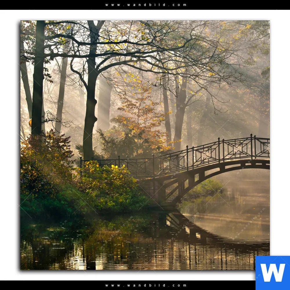 Alu-Dibond Bild | Idyllischer Wald mit Brücke | Quadrat