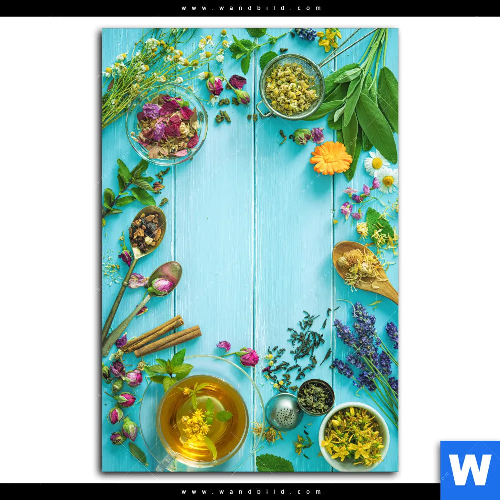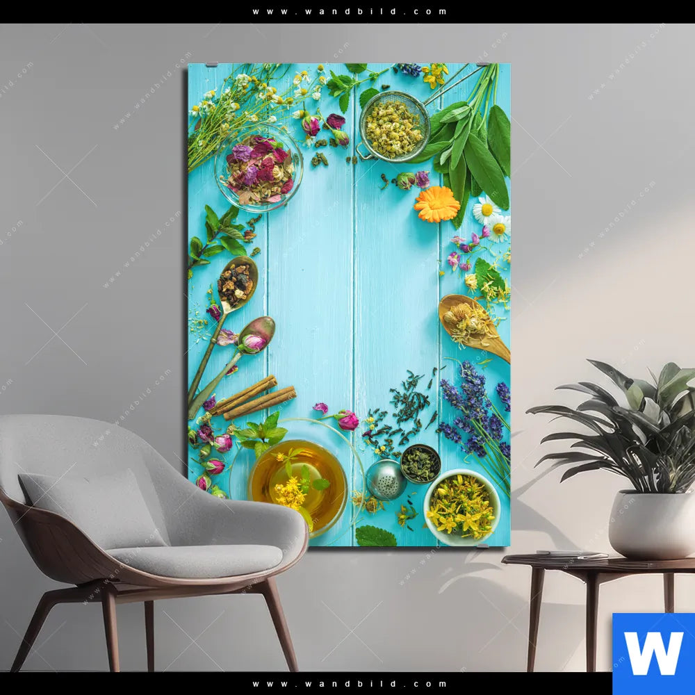 Alu-Dibond Bild | Kräuter auf blauem Holztisch | Hochformat