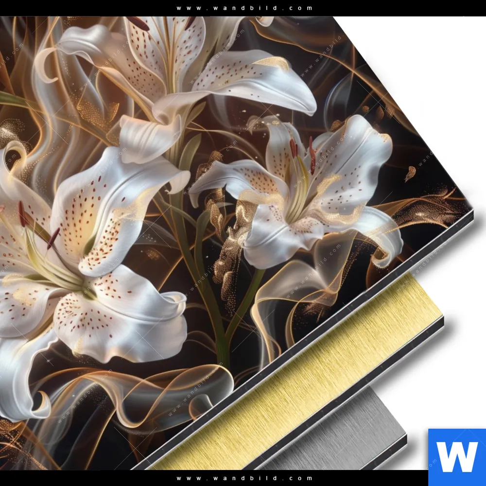Alu-Dibond Bild | Lilien in goldenem Rauch | Quadrat