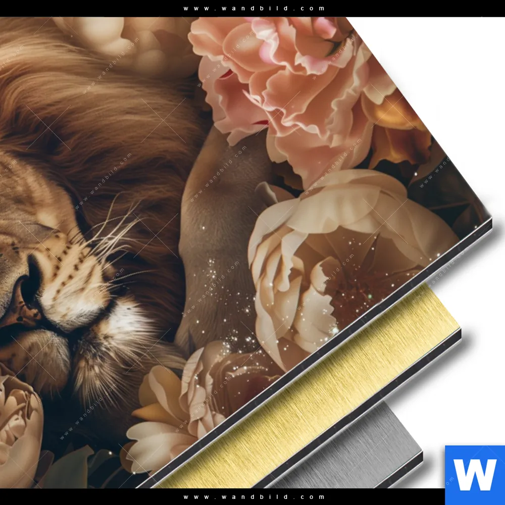Alu-Dibond Bild | Löwe schläft in Blüten | Querformat
