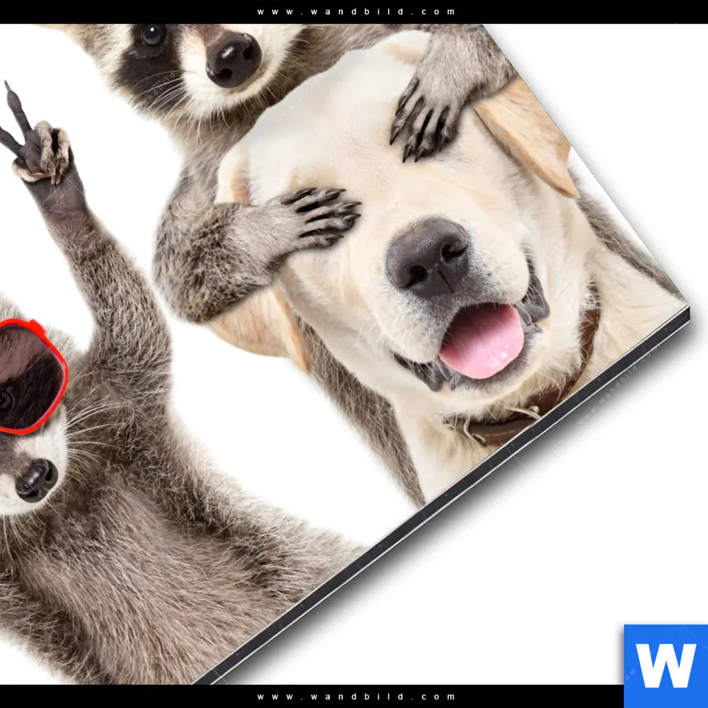 Alu-Dibond Bild | Lustige Waschbären mit Hund | Quadrat