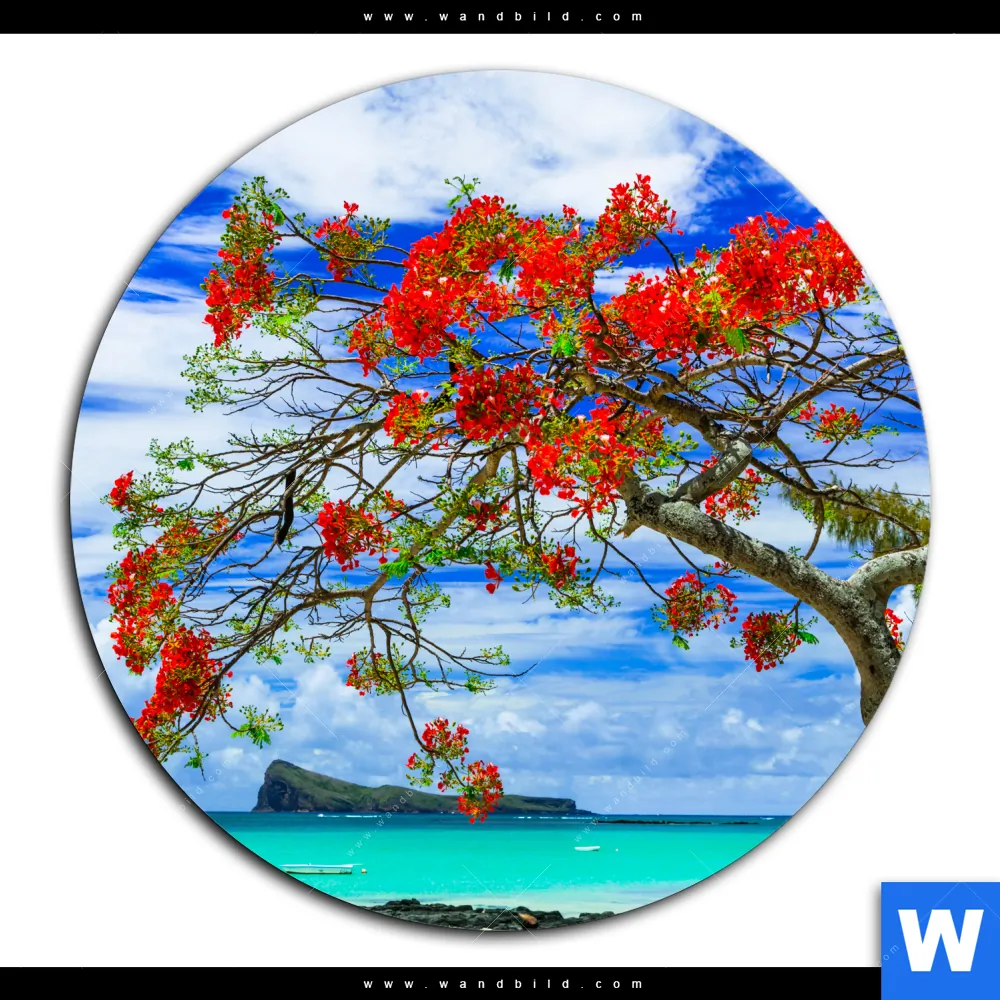 Alu-Dibond Bild | Rote Blüten und Türkisfarbenes Meer | Rund