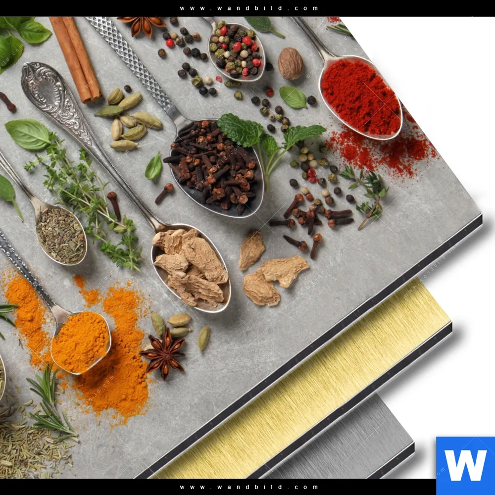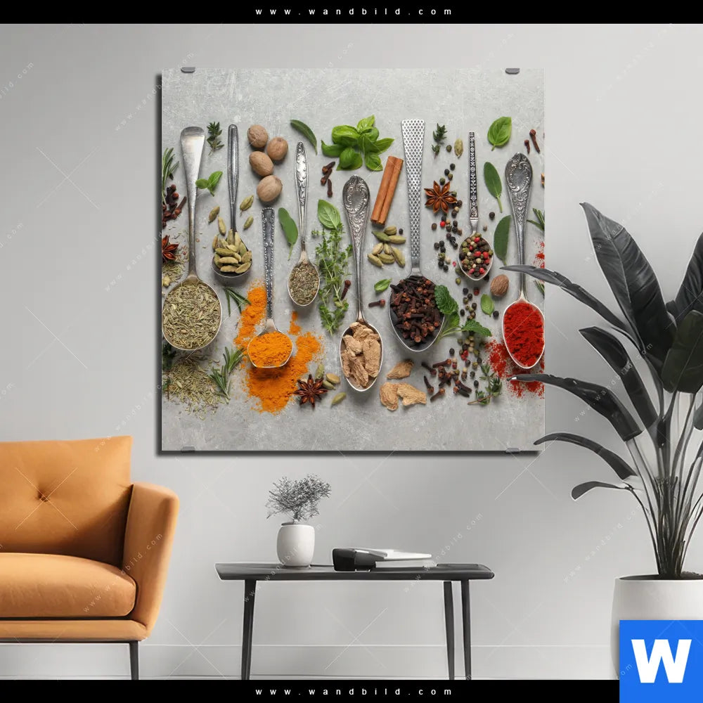 Alu-Dibond Bild | Silberlöffel mit Gewürzen | Quadrat