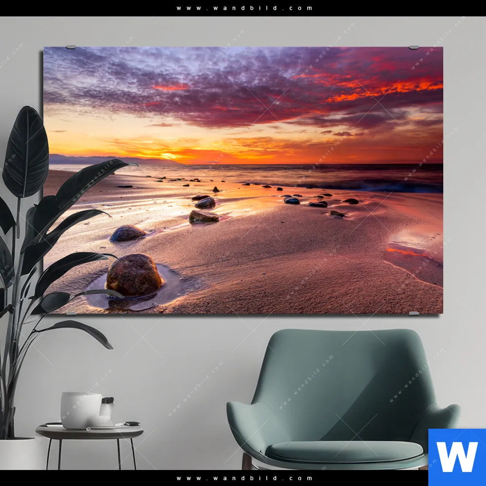 Alu-Dibond Bild | Sonnenuntergang am Strand mit Felsen | Querformat