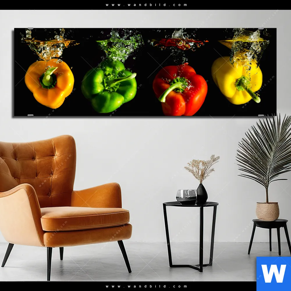 Alu-Dibond Bild | Spritzer von Paprika beim fallen ins Wasser | Panorama