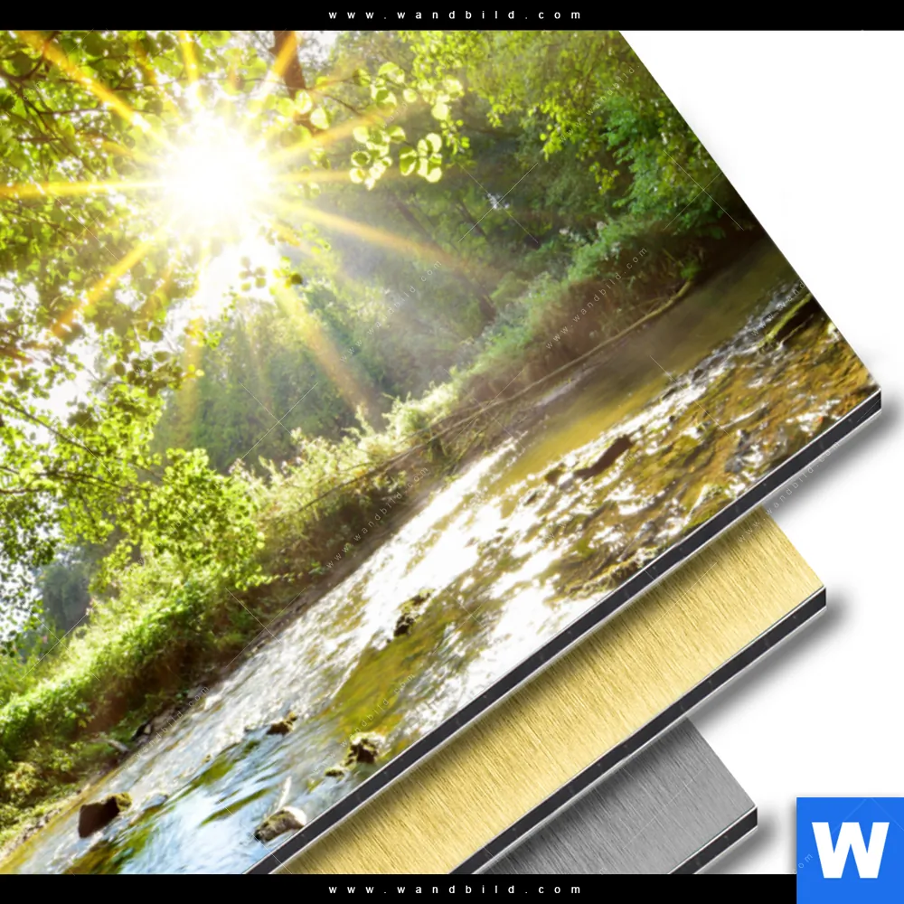 Alu-Dibond Bild | Wald mit Bach bei Sonnenschein | Querformat