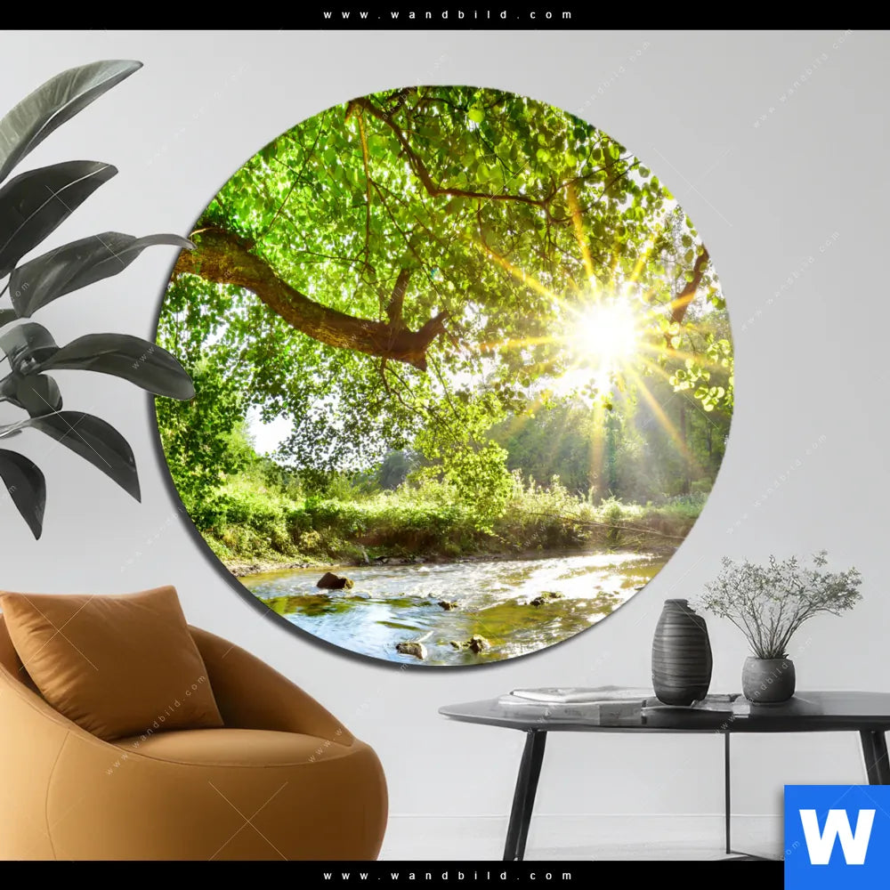 Alu-Dibond Bild | Wald mit Bach bei Sonnenschein | Rund