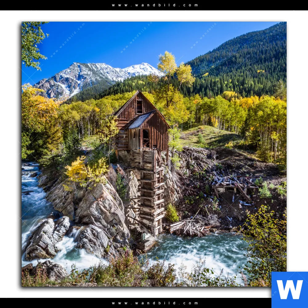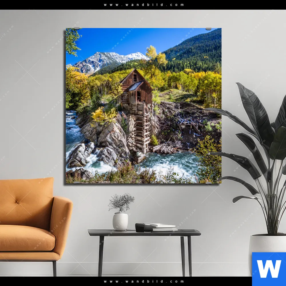 Alu-Dibond Bild | Waldhütte am Fluss | Quadrat