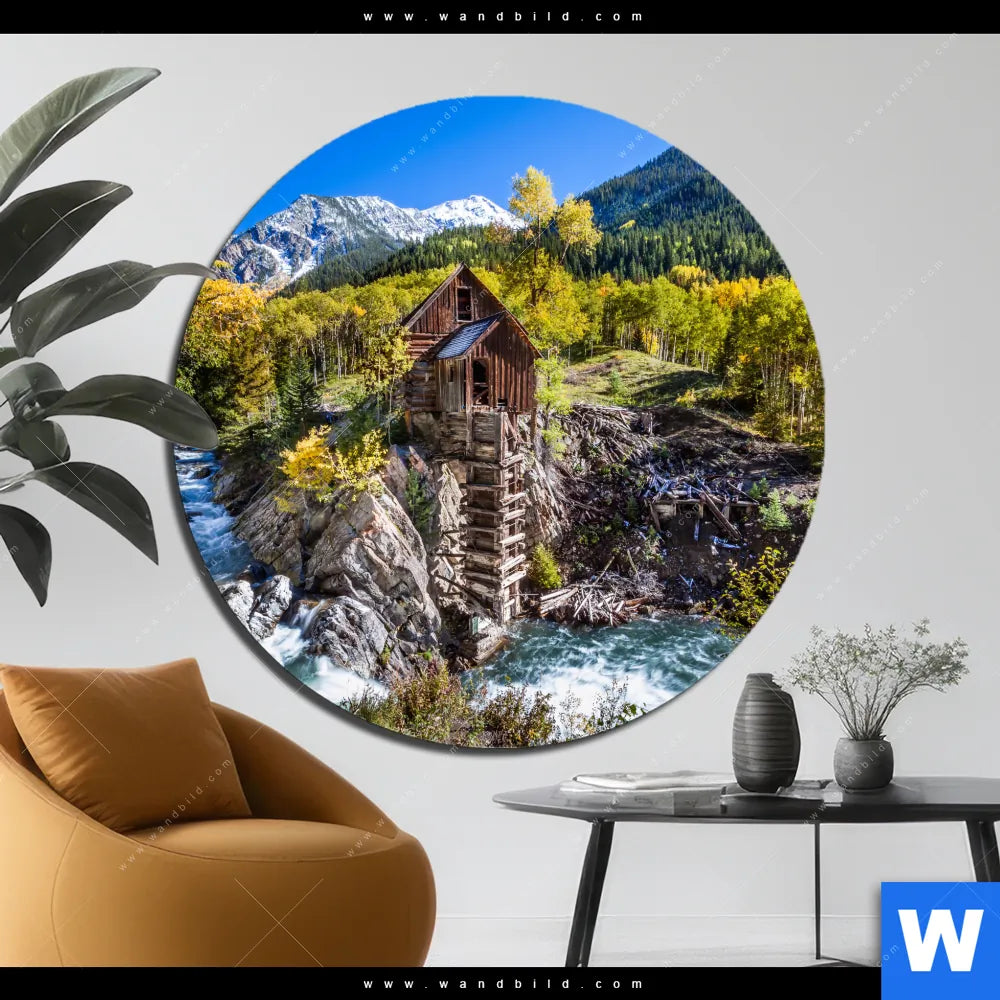 Alu-Dibond Bild | Waldhütte am Fluss | Rund