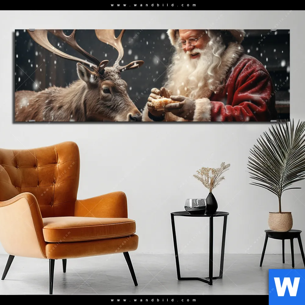 Alu-Dibond Bild | Weihnachtsmann füttert Rentier | Panorama