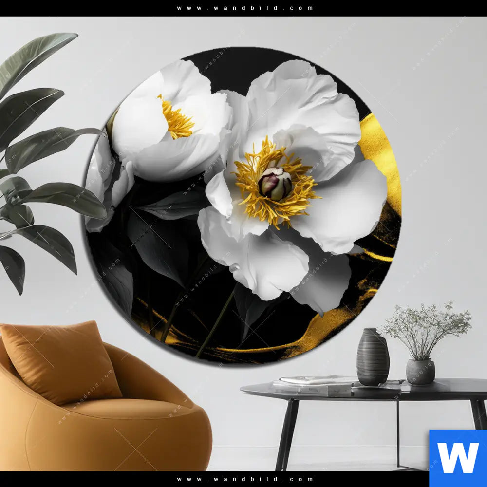 Alu-Dibond Bild | Weiße Blumen mit Gold | Rund