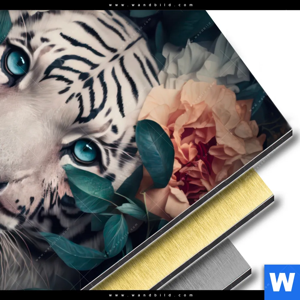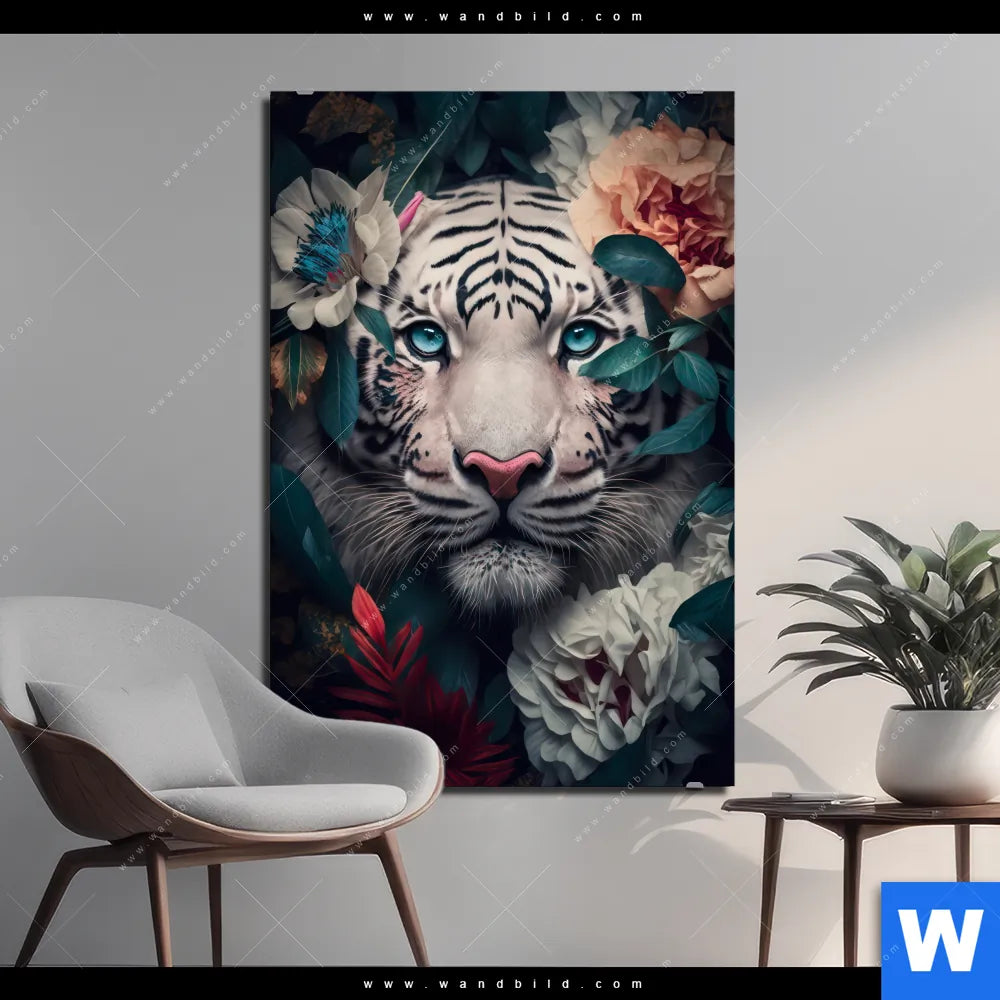 Alu-Dibond Bild | Weißer Tiger mit blauen Augen zwischen Blumen | Hochformat