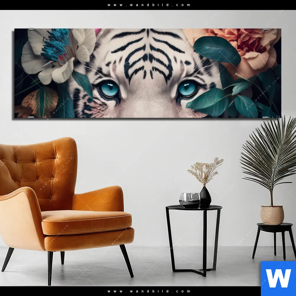 Alu-Dibond Bild | Weißer Tiger mit blauen Augen zwischen Blumen | Panorama
