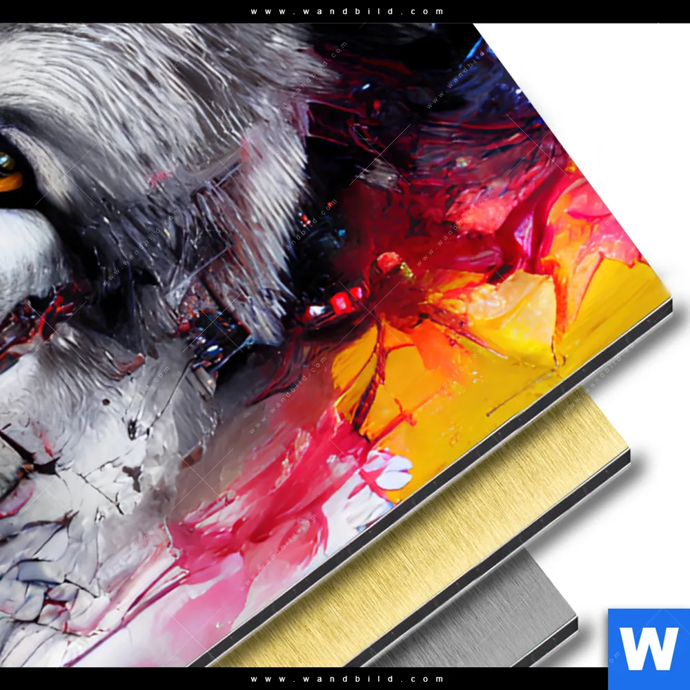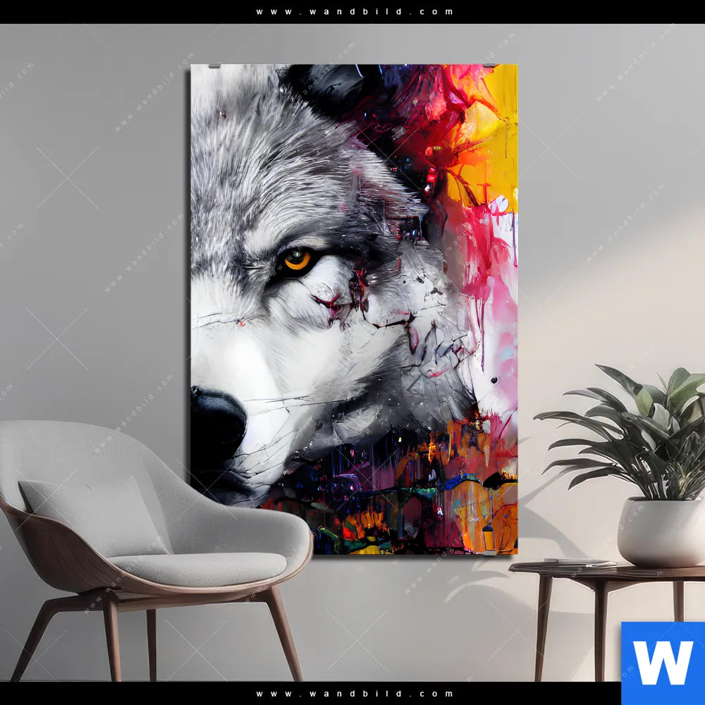 Alu-Dibond Bild | Wolf mit bunten Farbspritzern | Hochformat