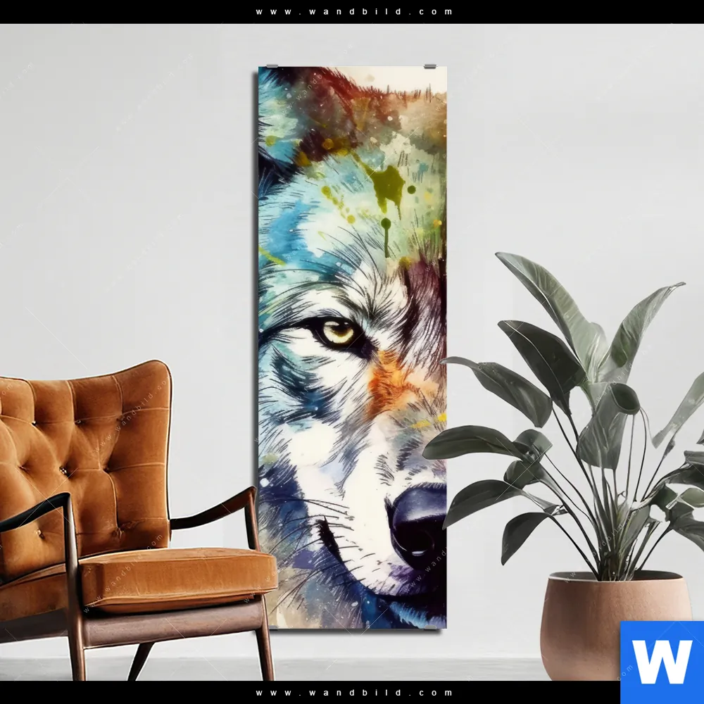 Alu-Dibond Bild | Wolf mit bunten Farbspritzern No. 2 | Schmal
