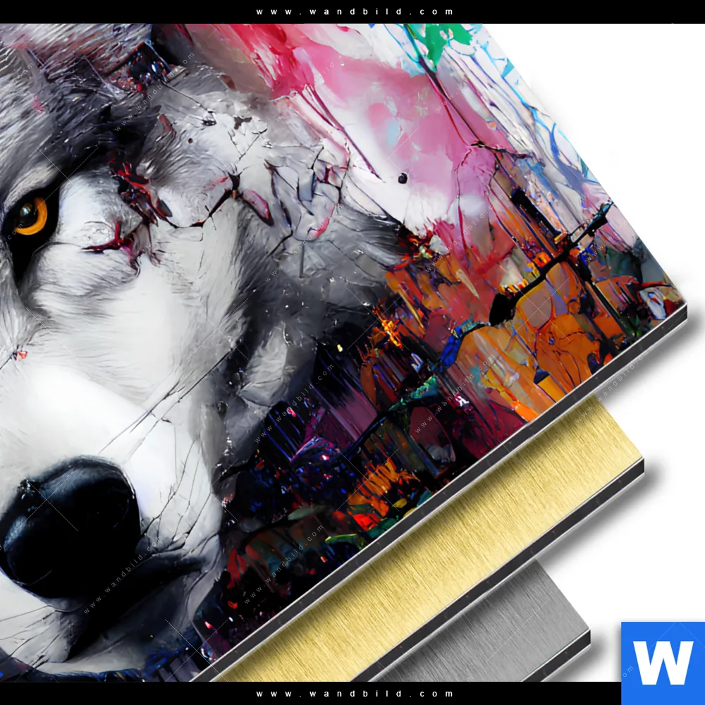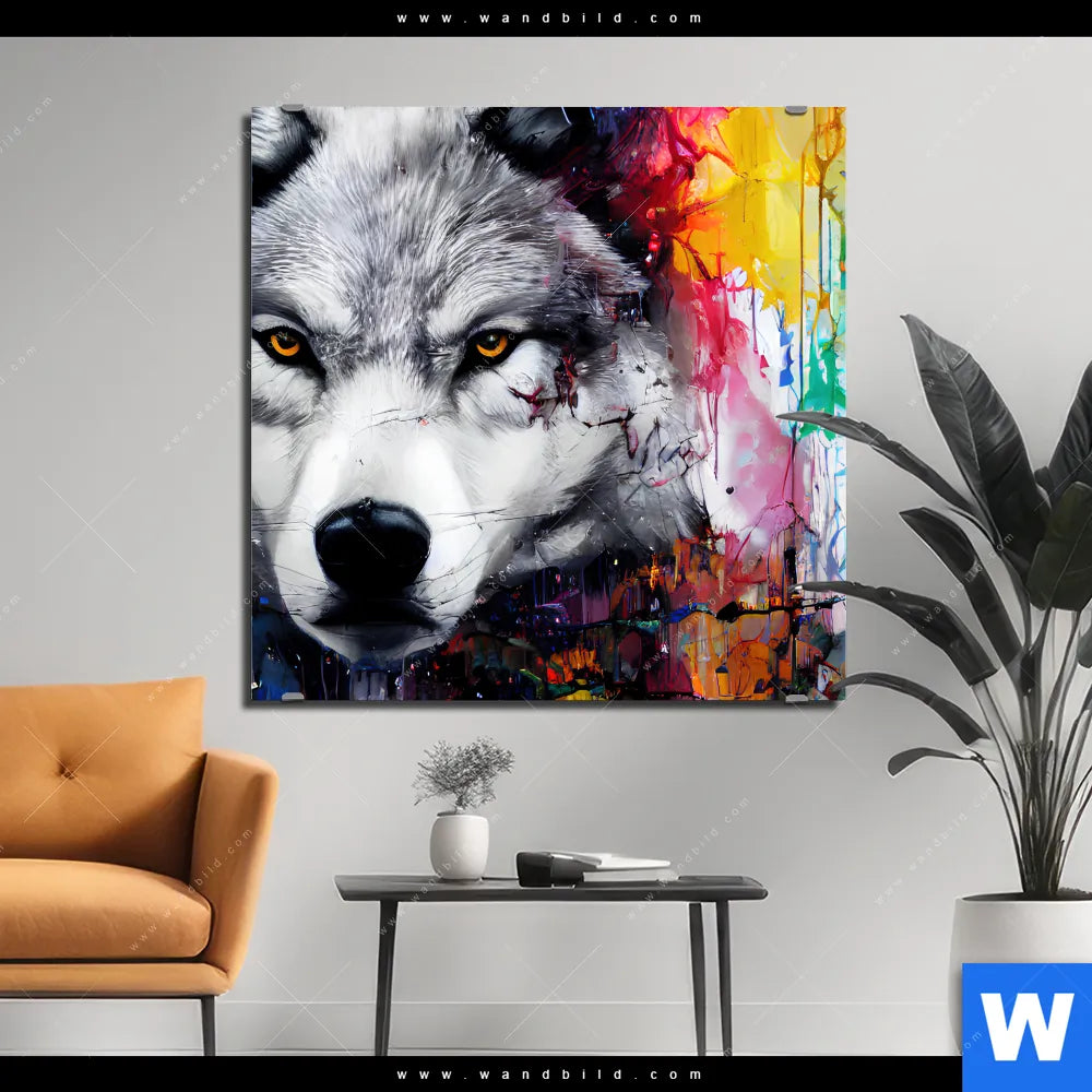 Alu-Dibond Bild | Wolf mit bunten Farbspritzern | Quadrat