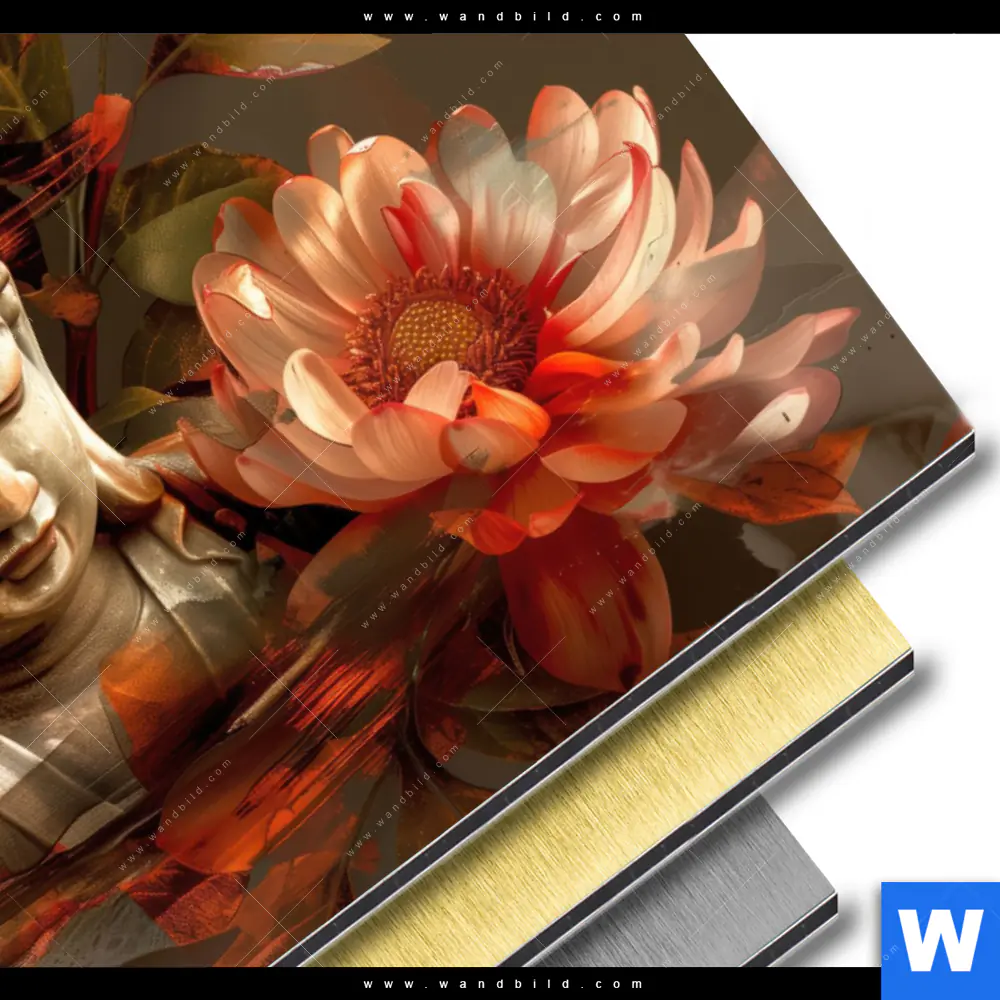 Buddha - Feng Shui, Blumen - Botanik Aluminiumbild mit metallischem Effekt inkl. vormontiertem Rückrahmen