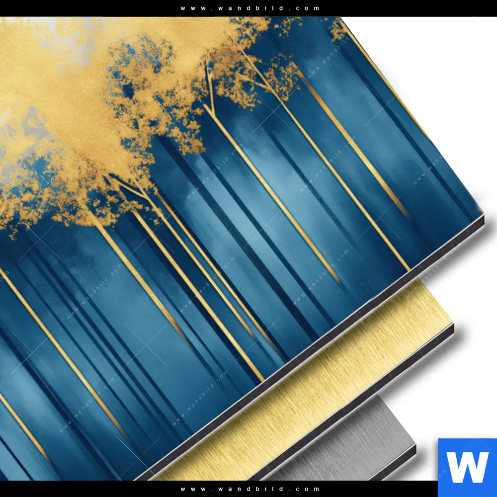 Aluminiumbild gebürstet | Abstrakter Wald - Blau & Gold | Querformat