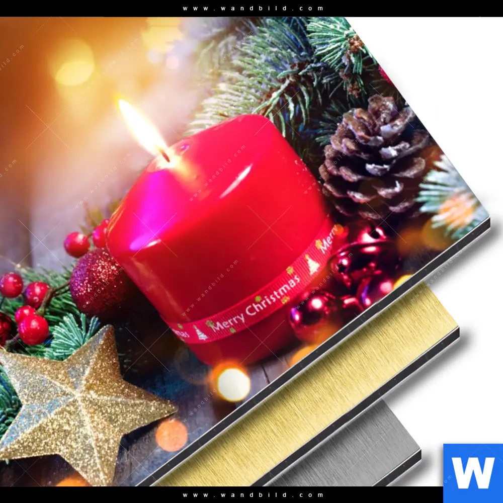 Aluminiumbild gebürstet | Adventskerze mit Weihnachtsschmuck | Quadrat