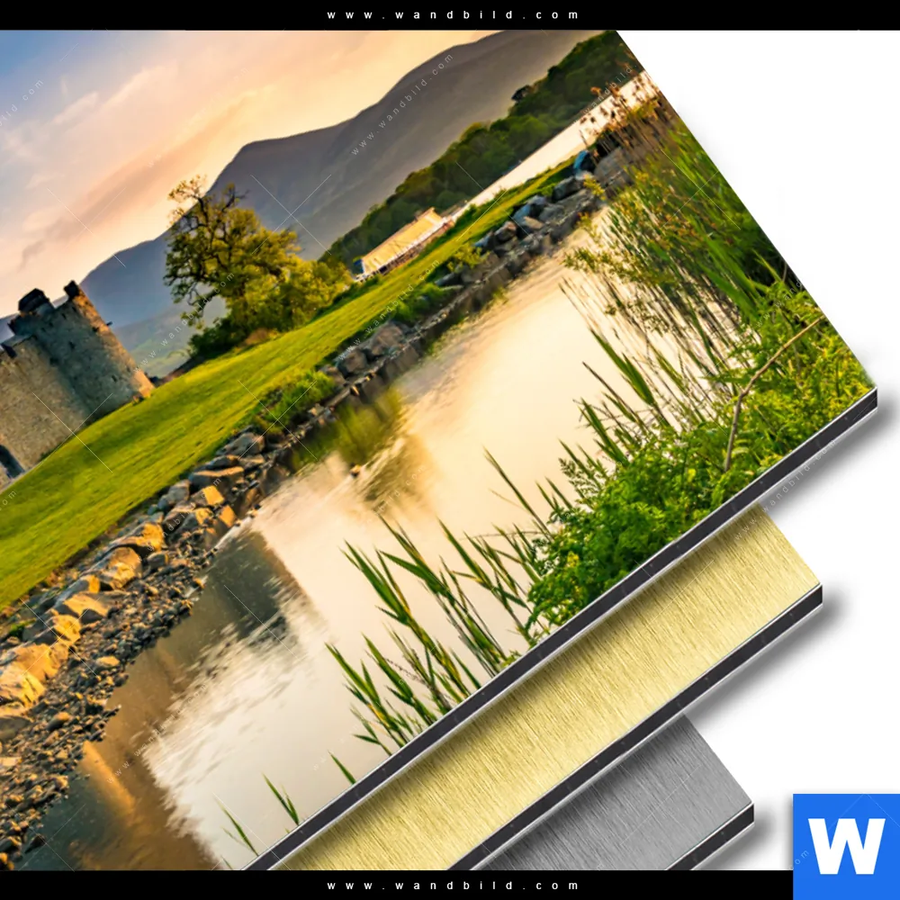 Aluminiumbild gebürstet | Alte Burg mit See | Querformat