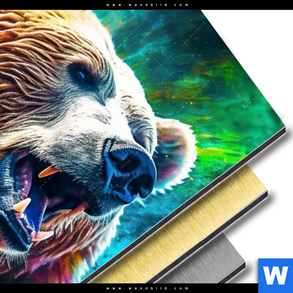 Aluminiumbild gebürstet | Bär in Neonfarben | Hochformat