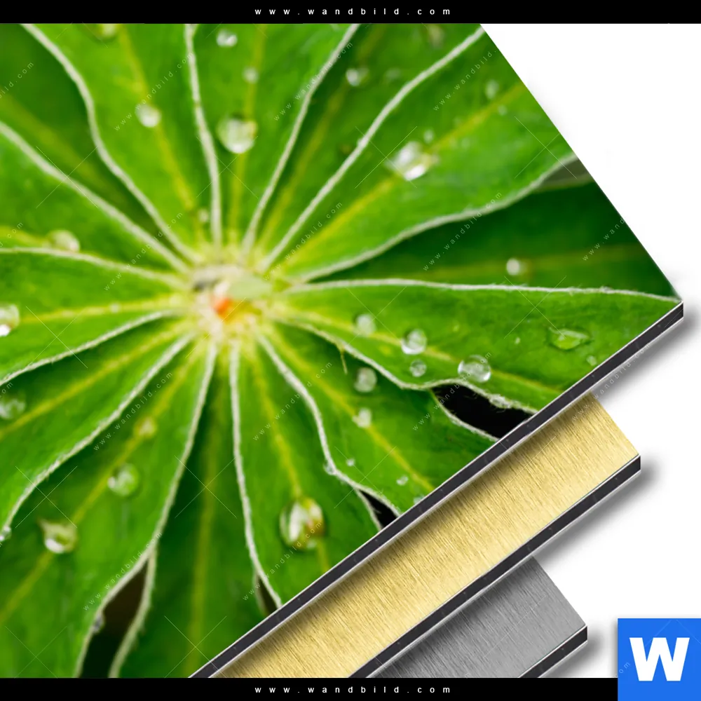 Aluminiumbild gebürstet | Blatt mit Wassertropfen | Querformat