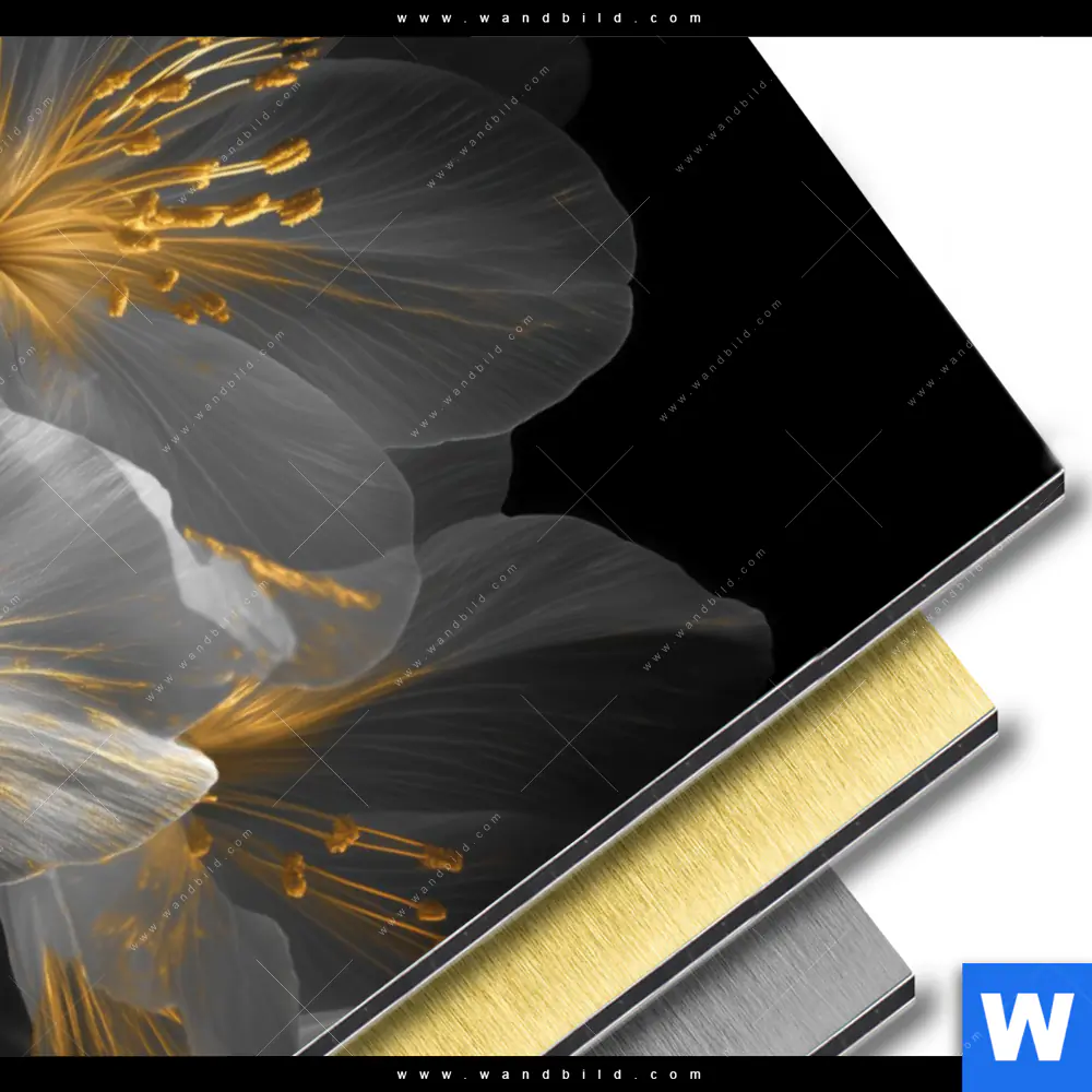 Aluminiumbild gebürstet | Blüten Gold & Weiß | Hochformat