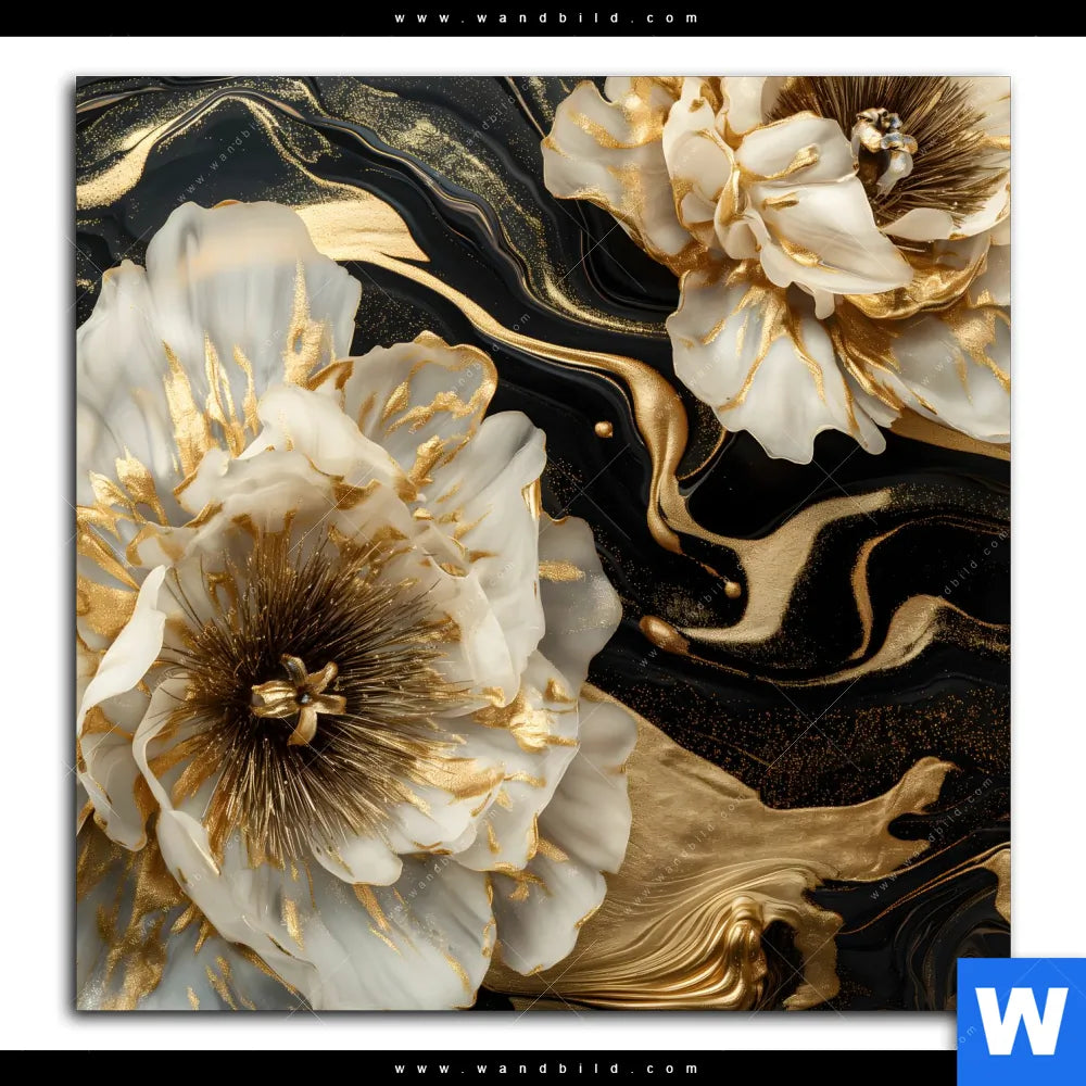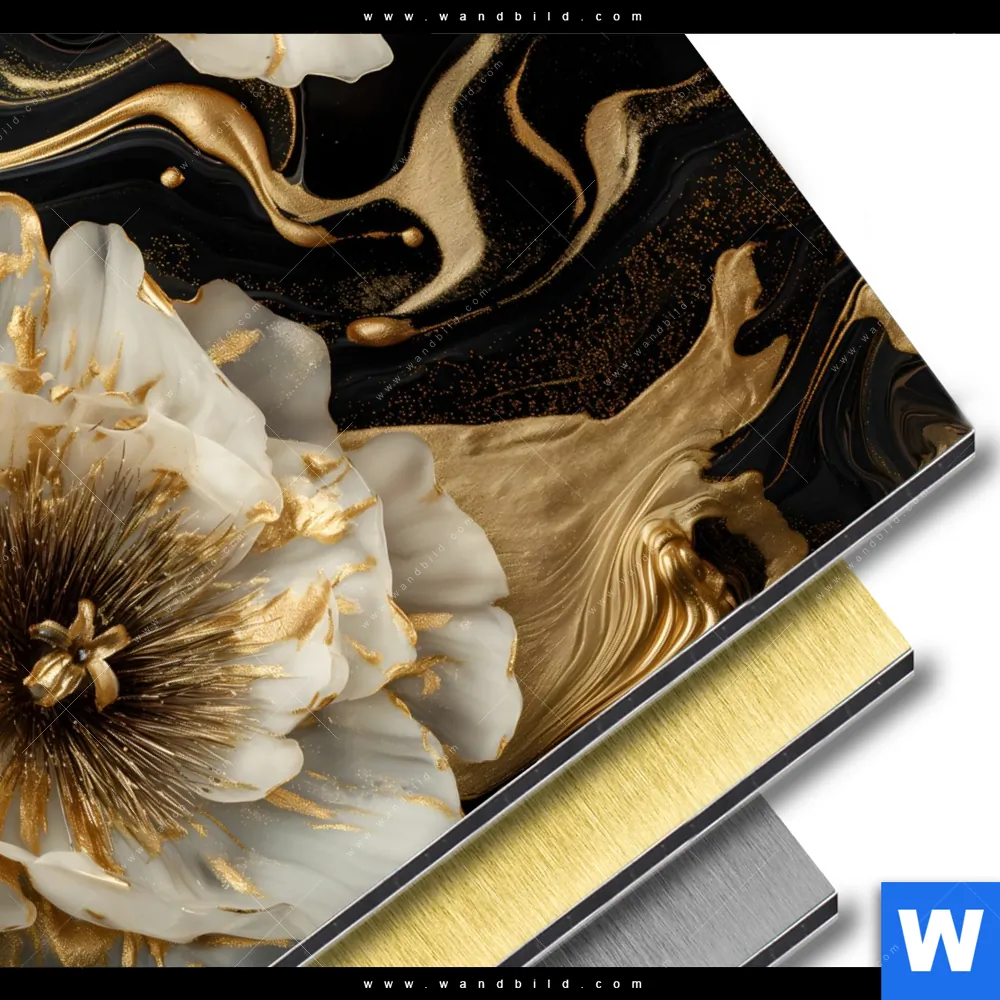 Aluminiumbild gebürstet | Blüten Gold Weiß Schwarz | Quadrat