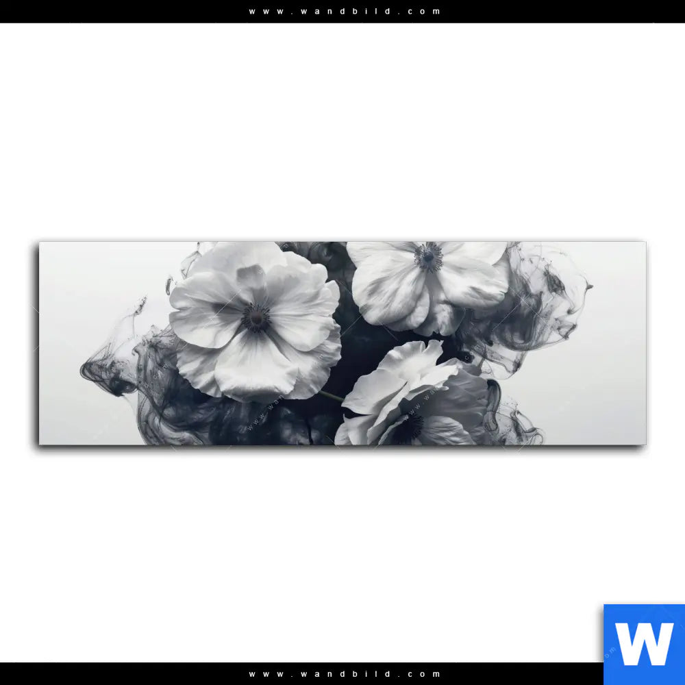 Aluminiumbild gebürstet | Blumen im schwarzen Farbnebel | Panorama
