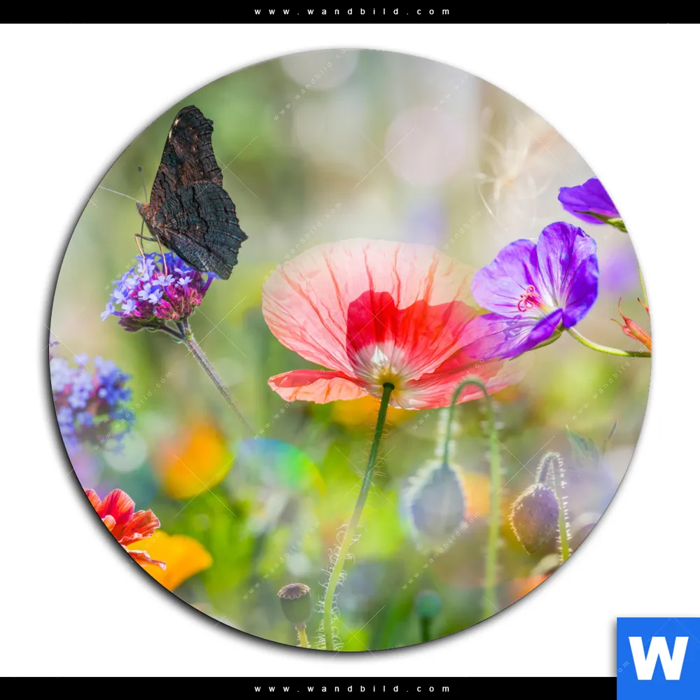 Aluminiumbild gebürstet | Blumenwiese mit Schmetterlingen | Rund