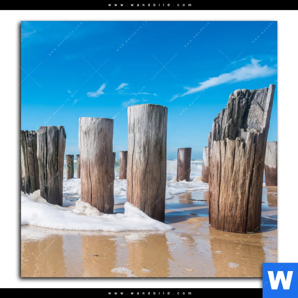 Aluminiumbild gebürstet | Buhnen in Wellen am Strand | Quadrat