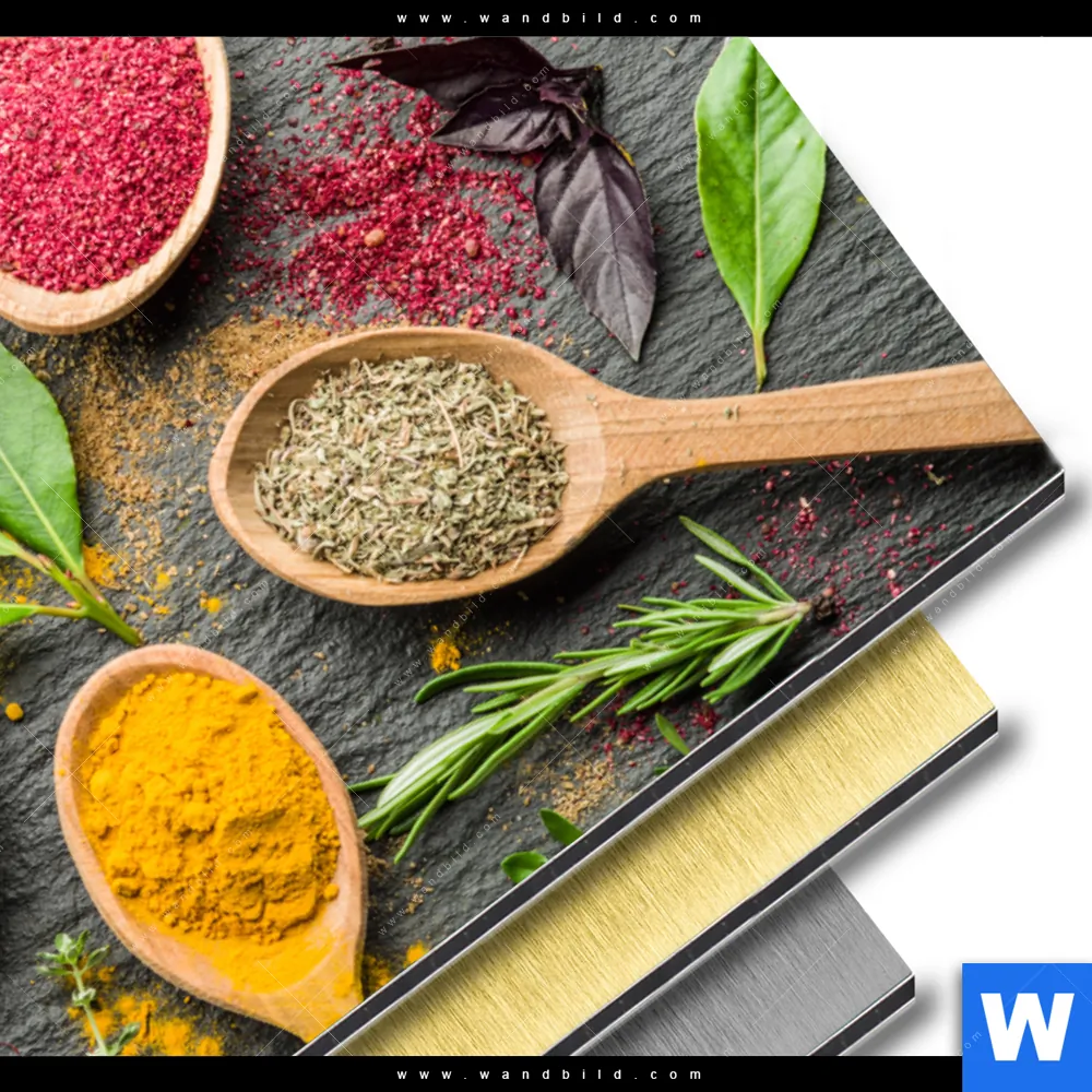 Aluminiumbild gebürstet | Bunte Gewürze in Holzlöffeln | Hochformat