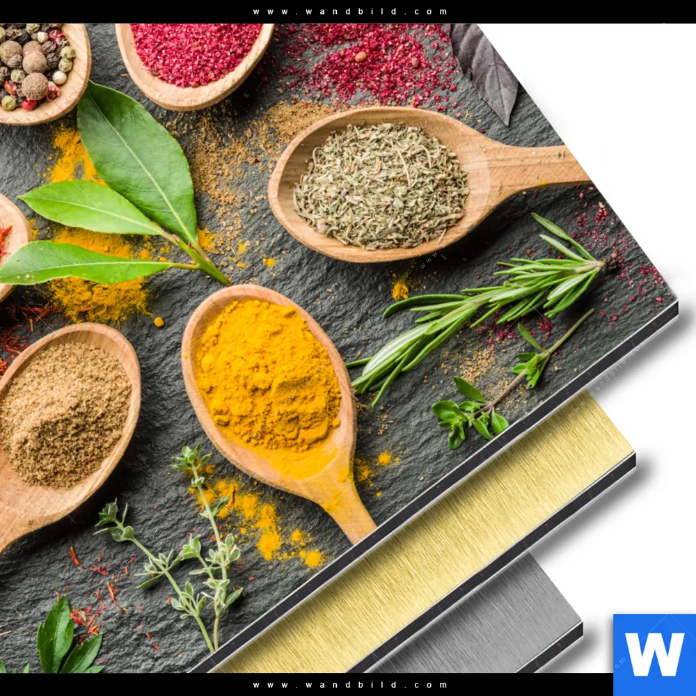 Aluminiumbild gebürstet | Bunte Gewürze in Holzlöffeln | Quadrat