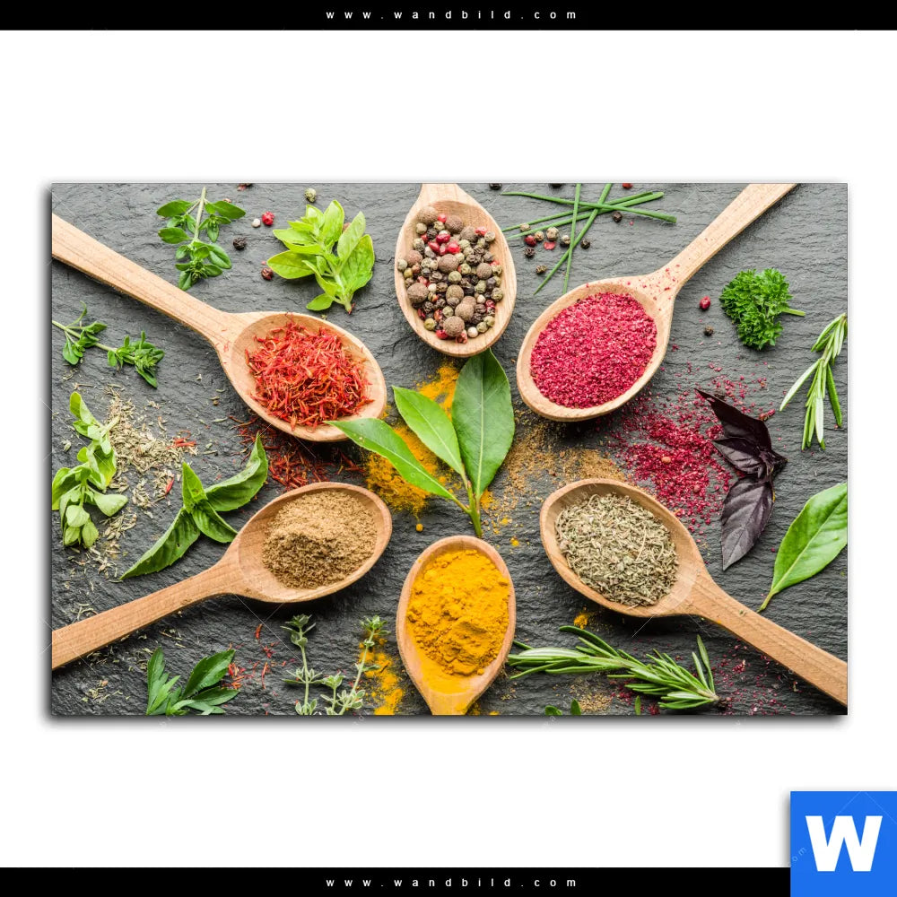Aluminiumbild gebürstet | Bunte Gewürze in Holzlöffeln | Querformat