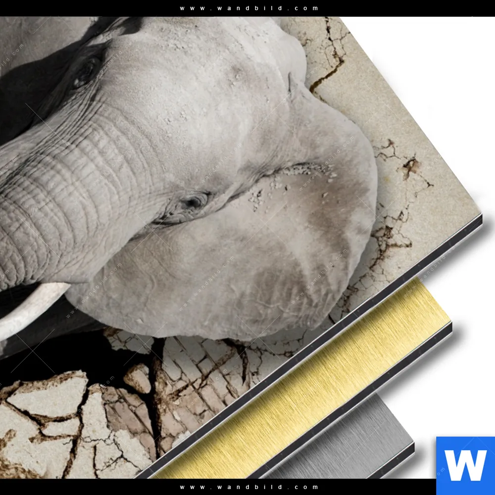Aluminiumbild gebürstet | Elefant bricht durch Mauer | Hochformat