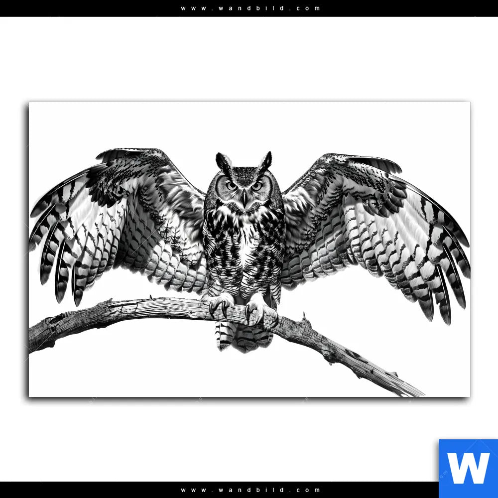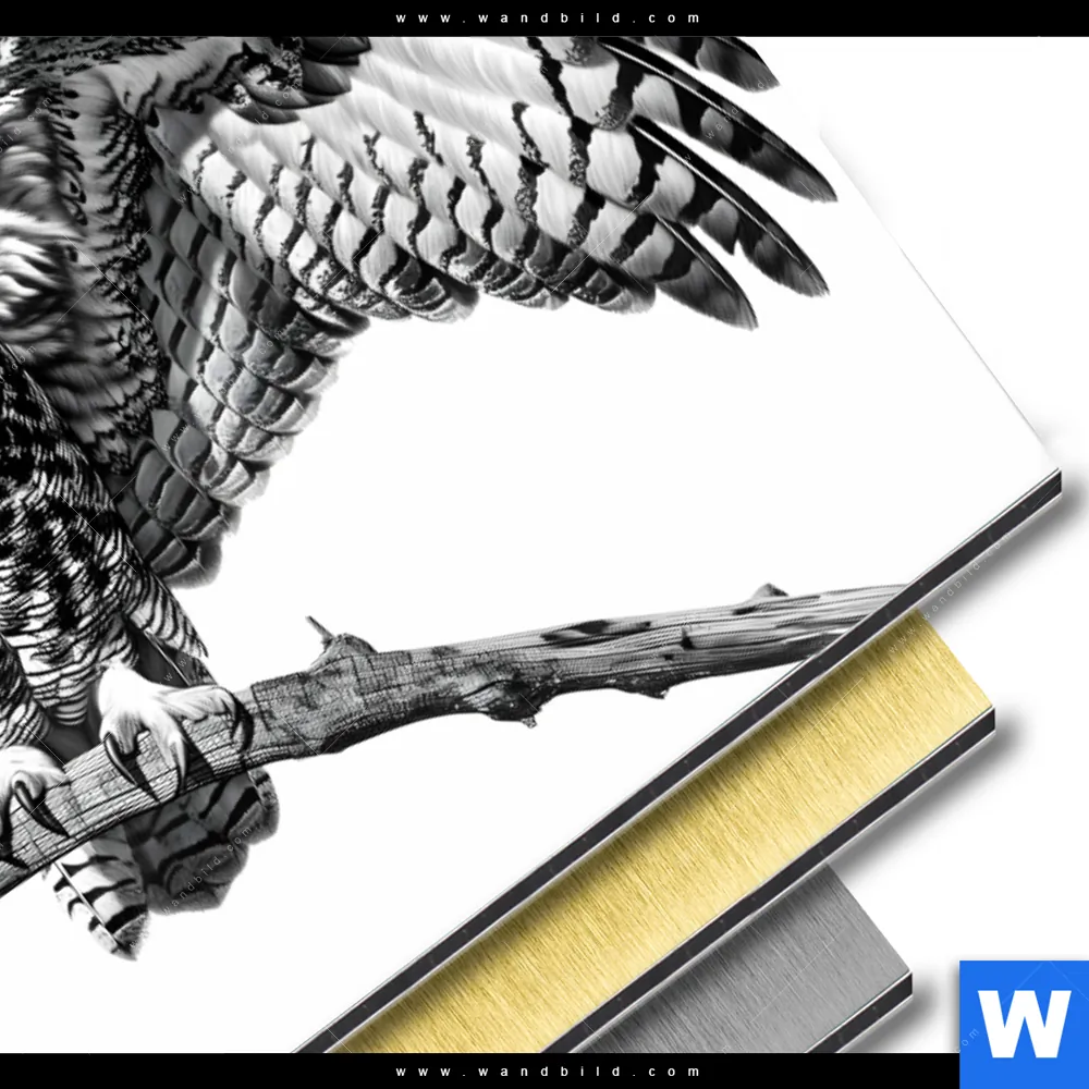 Aluminiumbild gebürstet | Eule auf Ast | Querformat